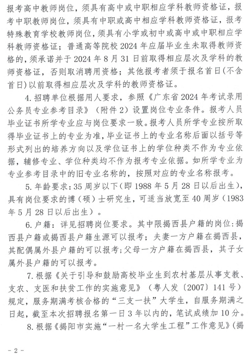 2024年我縣計劃公開招聘教師共48名,其中:高中教師32名、中職教師13名、特殊教育學(xué)校教師3名。具體招聘資格條件、崗位、人數(shù)詳見《2024年揭西縣公開招聘教師崗位表》(附件1)。