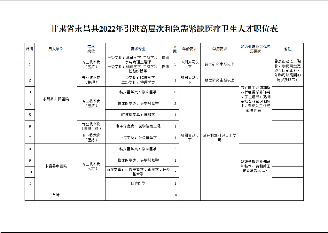 根據(jù)永昌縣醫(yī)療衛(wèi)生單位專業(yè)技術(shù)崗位緊缺實際,經(jīng)縣委人才工作領(lǐng)導(dǎo)小組、縣委編辦和人社部門審定同意,計劃為永昌縣衛(wèi)生健康系統(tǒng)面向全國引進(jìn)高層次和急需緊缺醫(yī)療衛(wèi)生人才25名。