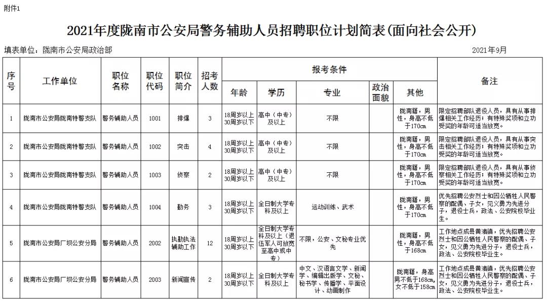 1、2021年度隴南市公安局警務(wù)輔助人員招聘職位計(jì)劃簡表(面向社會(huì)公開)