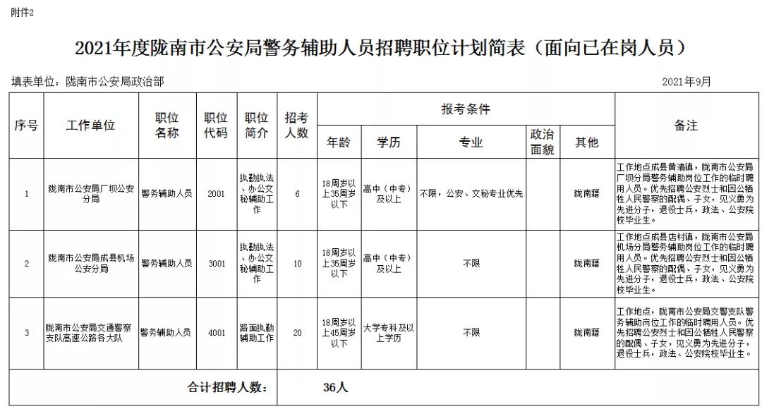 (二)隴南市公安局招聘警務(wù)輔助人員36名(面向已在隴南市公安局廠壩公安分局、機(jī)場分局、交警支隊(duì)警務(wù)輔助崗位工作的臨時(shí)聘用人員),具體崗位如下: