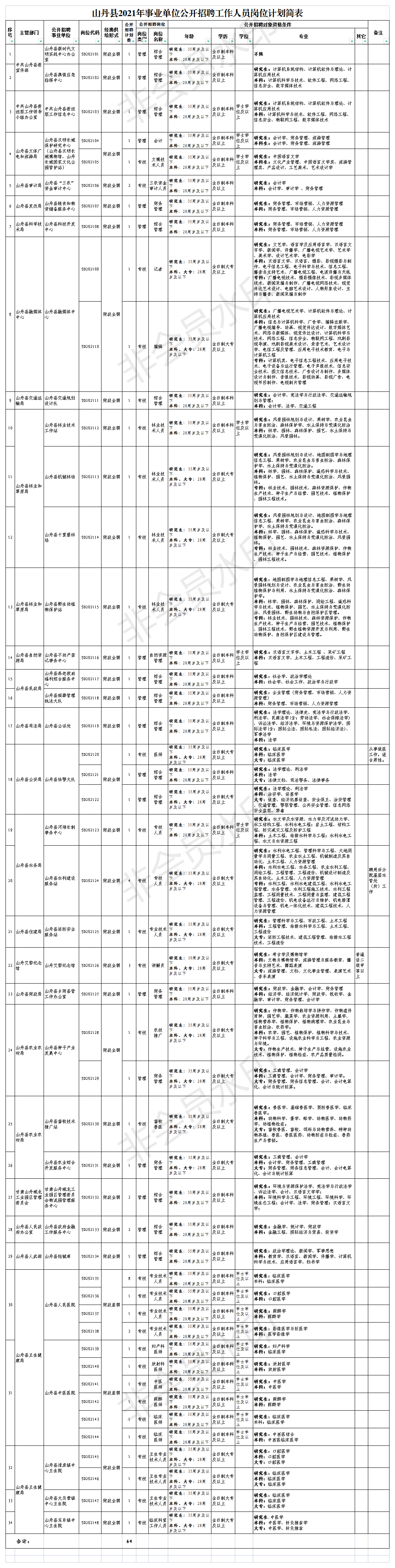 全縣公開(kāi)招聘事業(yè)單位工作人員64名。具體招聘計(jì)劃詳見(jiàn)《山丹縣2021年度事業(yè)單位公開(kāi)招聘工作人員崗位計(jì)劃簡(jiǎn)表》(附件1,以下簡(jiǎn)稱《崗位簡(jiǎn)表》)。