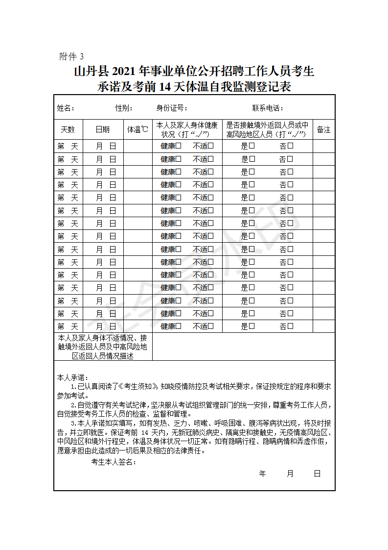 3.《山丹縣2021年事業(yè)單位公開(kāi)招聘工作人員考生承諾及考前14天體溫自我監(jiān)測(cè)登記表》