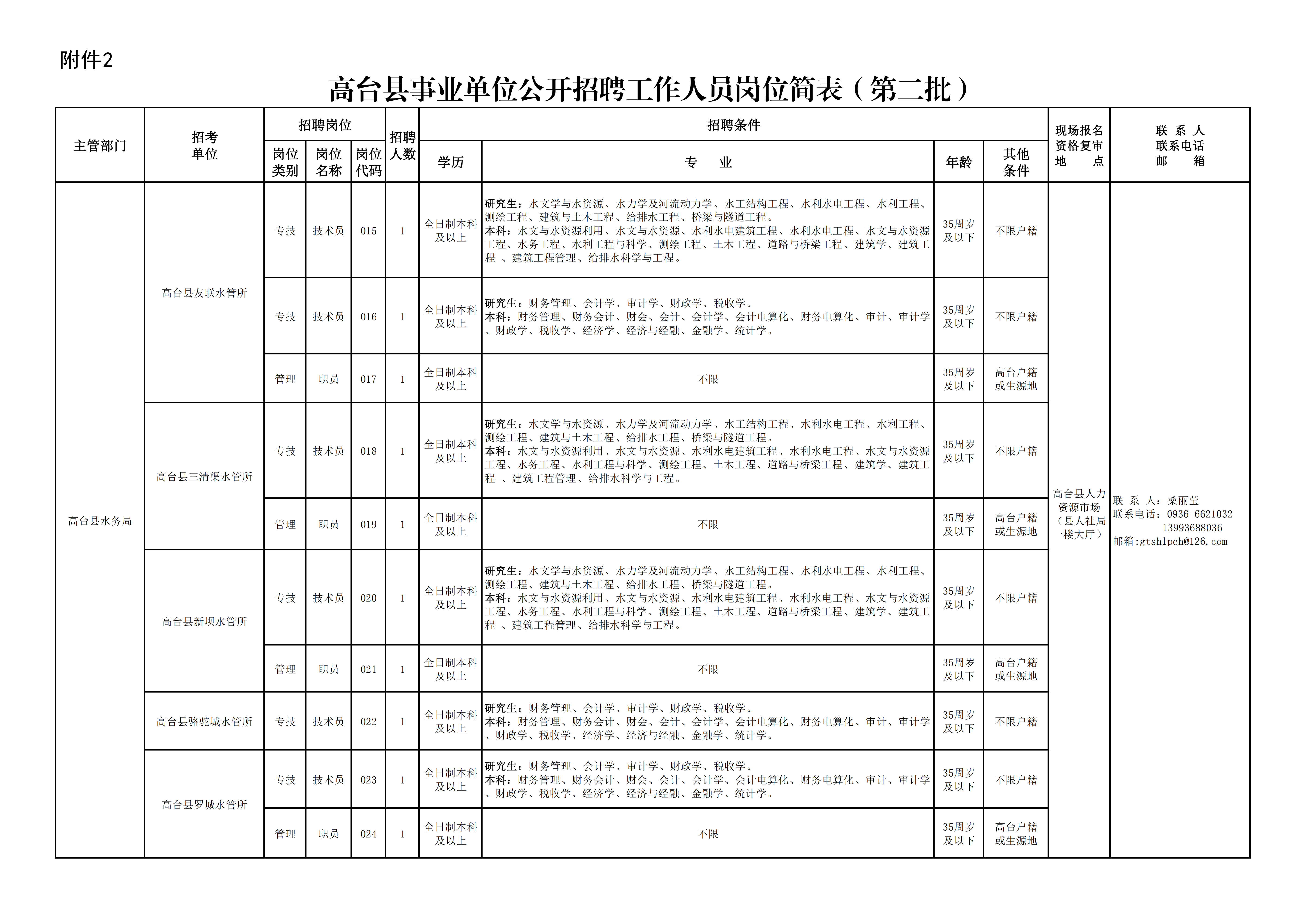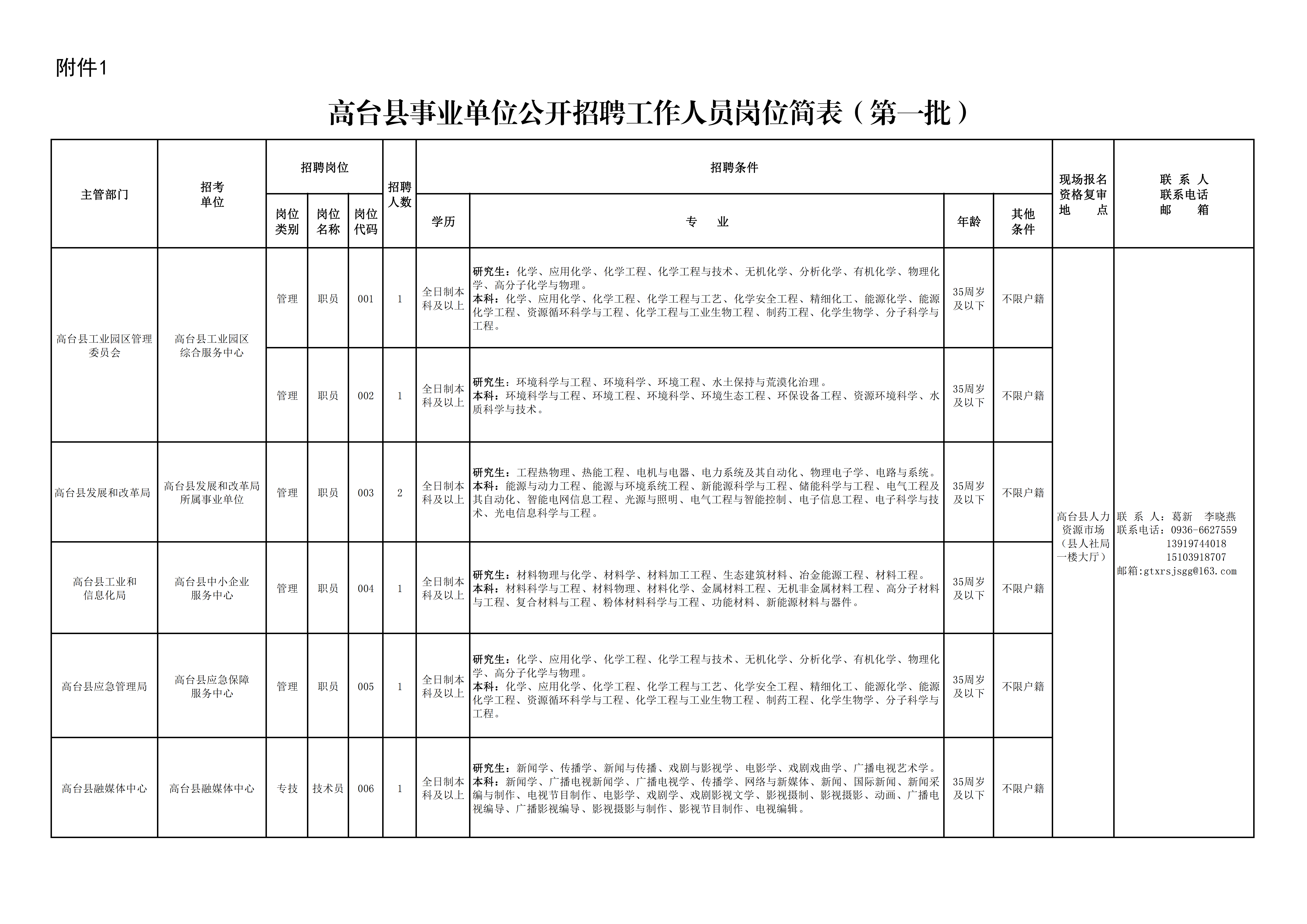 6.具備招聘崗位要求的其他條件,詳見《高臺(tái)縣事業(yè)單位公開招聘工作人員崗位簡(jiǎn)表》(附件1、附件2,以下簡(jiǎn)稱《崗位簡(jiǎn)表》)。