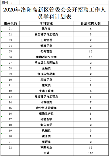 計(jì)劃公開招聘100人,涉及學(xué)科類別21個(gè),另設(shè)一個(gè)不限學(xué)科門類,各學(xué)科的招聘數(shù)量詳見《2020年洛陽高新區(qū)管委會公開招聘工作人員學(xué)科計(jì)劃表》(附件1),各學(xué)科類別的具體專業(yè)要求詳見《2020年洛陽高新區(qū)管委會公開招聘工作人員考試學(xué)科分類專業(yè)對照表》(附件2)。
