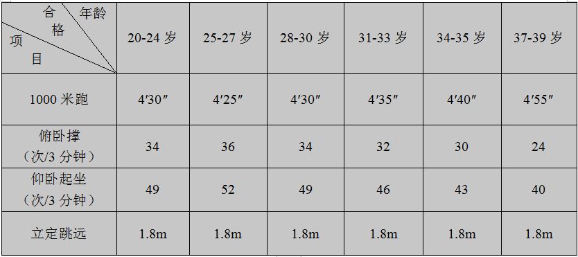 考生以上四個項目,如有一項未達(dá)到合格(60分)標(biāo)準(zhǔn)的,不得進(jìn)入面試環(huán)節(jié)。各測試項目合格標(biāo)準(zhǔn)見下表: