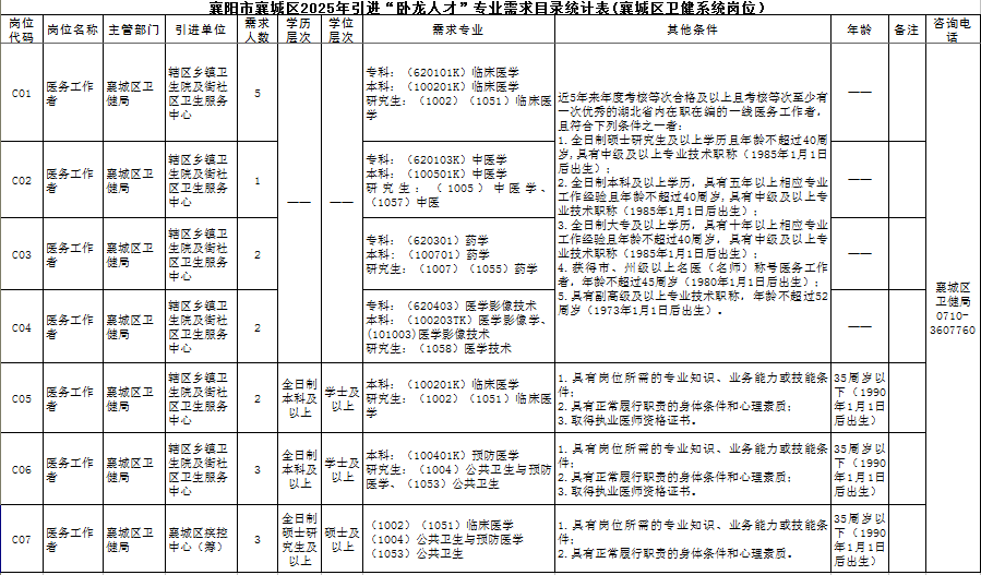 2025-06-06 14:42:00閱讀()襄陽(yáng)市衛(wèi)生健康委員會(huì)襄陽(yáng)市襄城區(qū)2025年度計(jì)劃引進(jìn)“臥龍人才”91名。其中,C類崗位為優(yōu)秀醫(yī)務(wù)工作者引才,共引進(jìn)18名。其中,C01-C04崗面向湖北省內(nèi)在職在編、專業(yè)技術(shù)精湛的一線醫(yī)務(wù)工作者,引進(jìn)10名;C05-C06崗面向普通高校全日制本科及以上學(xué)歷畢業(yè)生,并取得相應(yīng)學(xué)歷學(xué)位,同時(shí)需取得執(zhí)業(yè)醫(yī)師資格證書,引進(jìn)5名;C07崗面向國(guó)內(nèi)普通高?;蚝M庵咝H罩拼T士研究生及以上學(xué)歷的應(yīng)屆、往屆畢業(yè)生,引進(jìn)3名。
