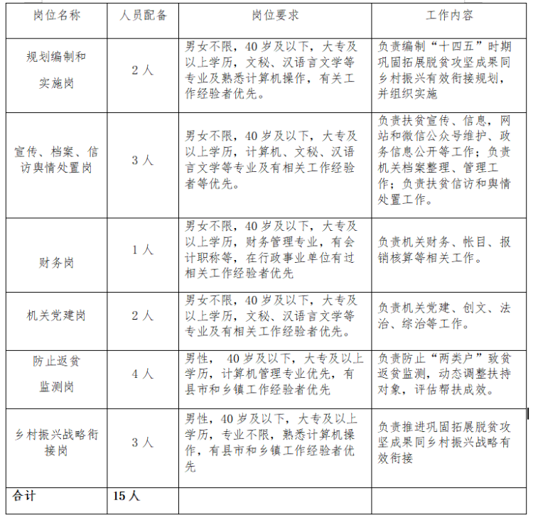 2021-02-01 22:33:25閱讀()襄陽(yáng)市人力資源和社會(huì)保障局襄陽(yáng)市人民政府扶貧開(kāi)發(fā)辦公室現(xiàn)委托湖北為盛人力資源開(kāi)發(fā)有限公司面向社會(huì)公開(kāi)招聘相關(guān)崗位工作人員15名(崗位要求和工作內(nèi)容附后),現(xiàn)將具體事項(xiàng)公告如下: