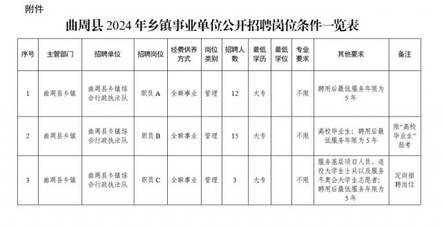 本次招聘崗位為曲周縣鄉(xiāng)鎮(zhèn)全額事業(yè)編制工作人員30名,其中,限“高校畢業(yè)生”報考崗位15名,定向招聘崗位3名。招聘人數、具體崗位、資格條件詳見《曲周縣2024年鄉(xiāng)鎮(zhèn)事業(yè)單位公開招聘崗位條件一覽表》。