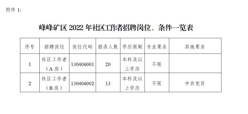 本次計劃公開招聘社區(qū)工作者33名。工作崗位及崗位人數(shù)詳見附表《峰峰礦區(qū)2022年社區(qū)工作者招聘崗位、條件一覽表》。
