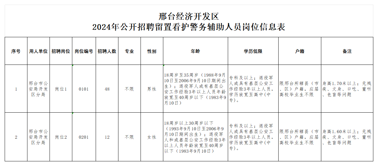 2024年邢臺經(jīng)濟(jì)開發(fā)區(qū)公開招聘留置看護(hù)警務(wù)輔助人員公告