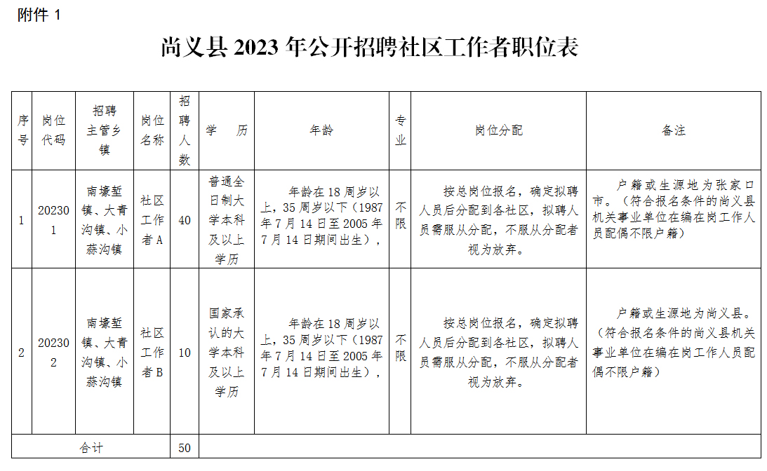 1.尚義縣2023年公開招聘社區(qū)工作者職位表