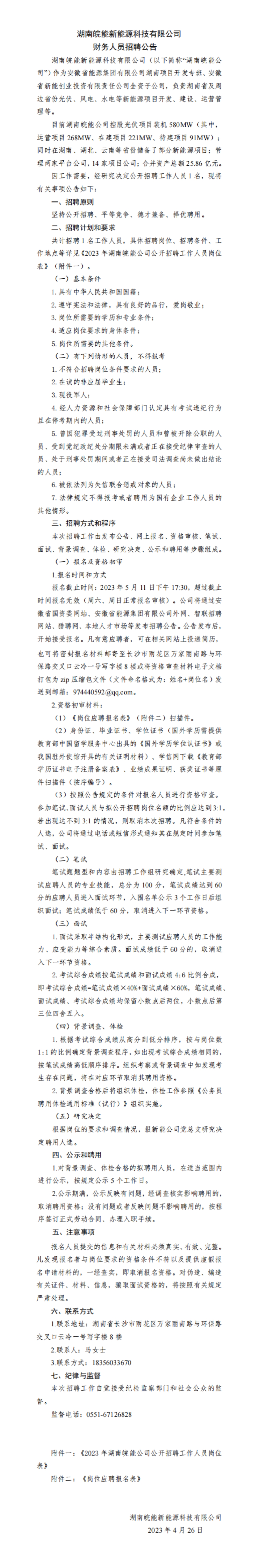 2023年湖南皖能新能源科技有限公司財務(wù)人員招聘公告