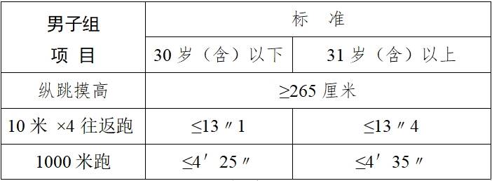 3.體能測評項目及標準:本次招聘體能測評共三項:縱跳摸高、10米×4往返跑、長跑(男子1000米跑)。體能測評參照《公安機關(guān)錄用人民警察體能測評項目和標準(暫行)》執(zhí)行,采取達標制。
