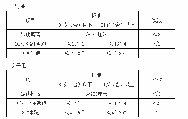 3.體能測評項(xiàng)目和標(biāo)準(zhǔn):按照《公安機(jī)關(guān)錄用人民警察體能測評項(xiàng)目和標(biāo)準(zhǔn)(暫行)》執(zhí)行。