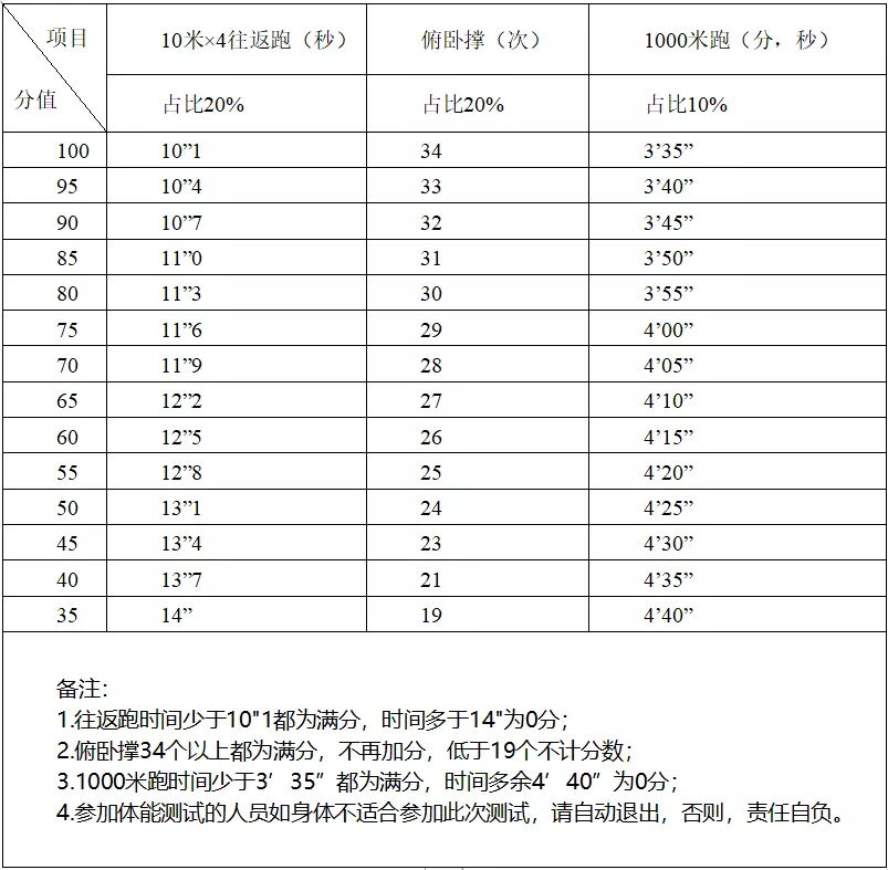 (3)C類考試進(jìn)行體測(cè)和面試。勤務(wù)類輔警體測(cè)項(xiàng)目共三項(xiàng):1000米跑、1分鐘俯臥撐、10×4往返跑(體測(cè)標(biāo)準(zhǔn)詳見(jiàn)附件六)。總成績(jī)按照體測(cè)成績(jī)占50%,面試成績(jī)占50%的比例確定。參加體測(cè)人數(shù)達(dá)到1:3比例按照體測(cè)成績(jī)從高分到低分順序確定參加面試人員;體測(cè)人數(shù)不足1:3比例,按實(shí)際人數(shù)進(jìn)入面試。