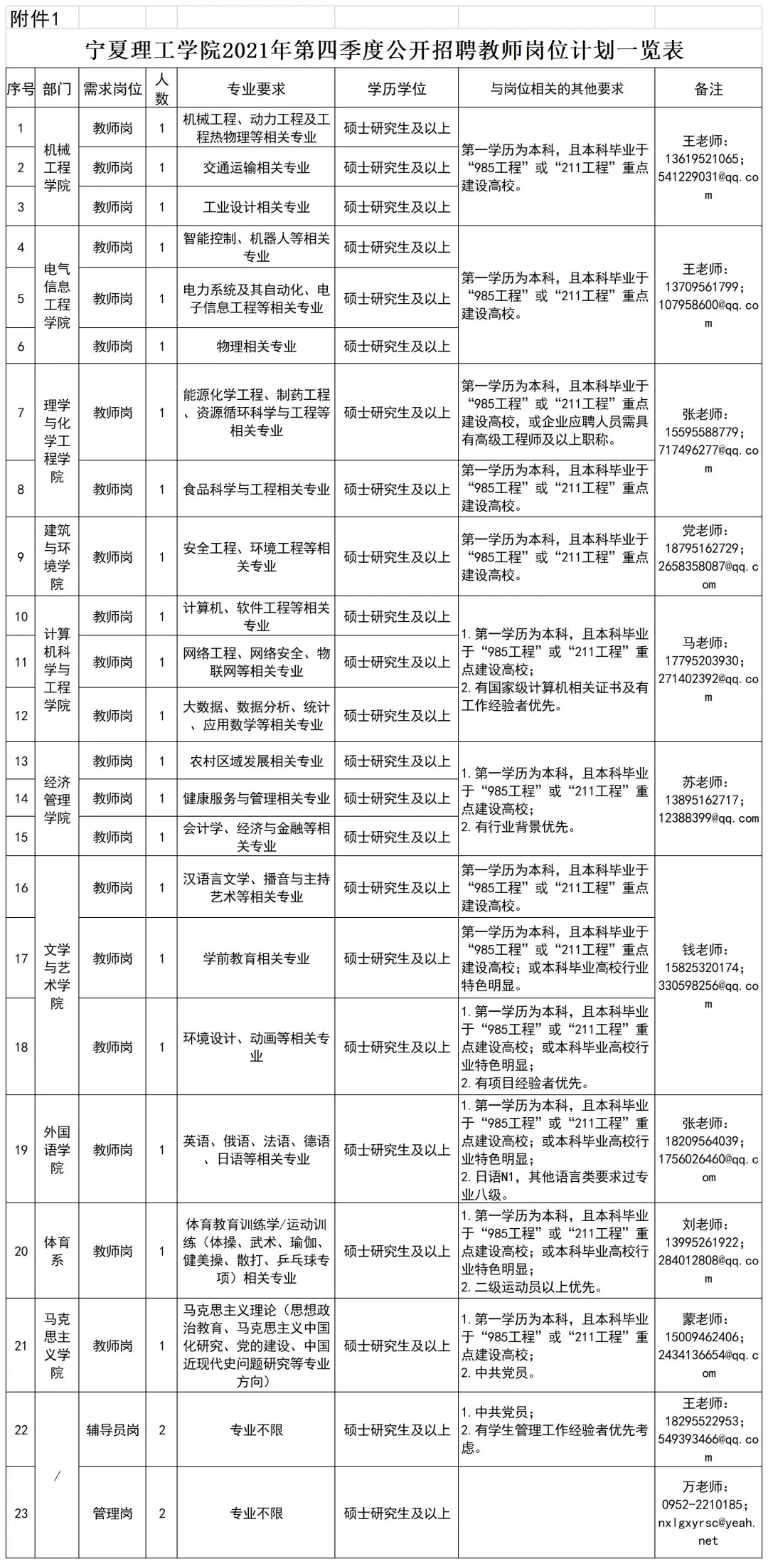 具體詳見(jiàn)《寧夏理工學(xué)院2021年第四季度公開(kāi)招聘教師崗位計(jì)劃一覽表》(見(jiàn)附件1)。
