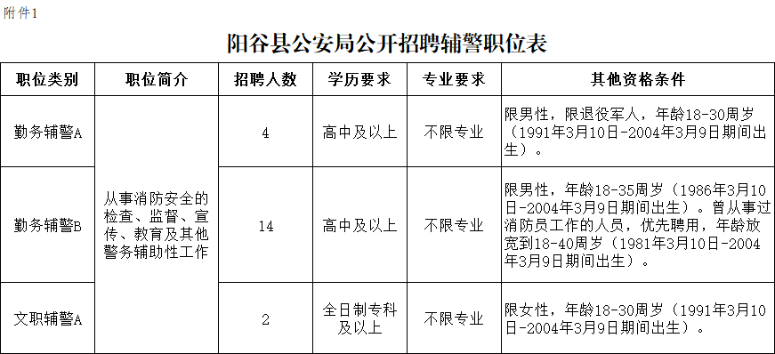 具體職位招聘人數(shù)及要求詳見《陽谷縣公安局公開招聘輔警職位表》(附件1)。