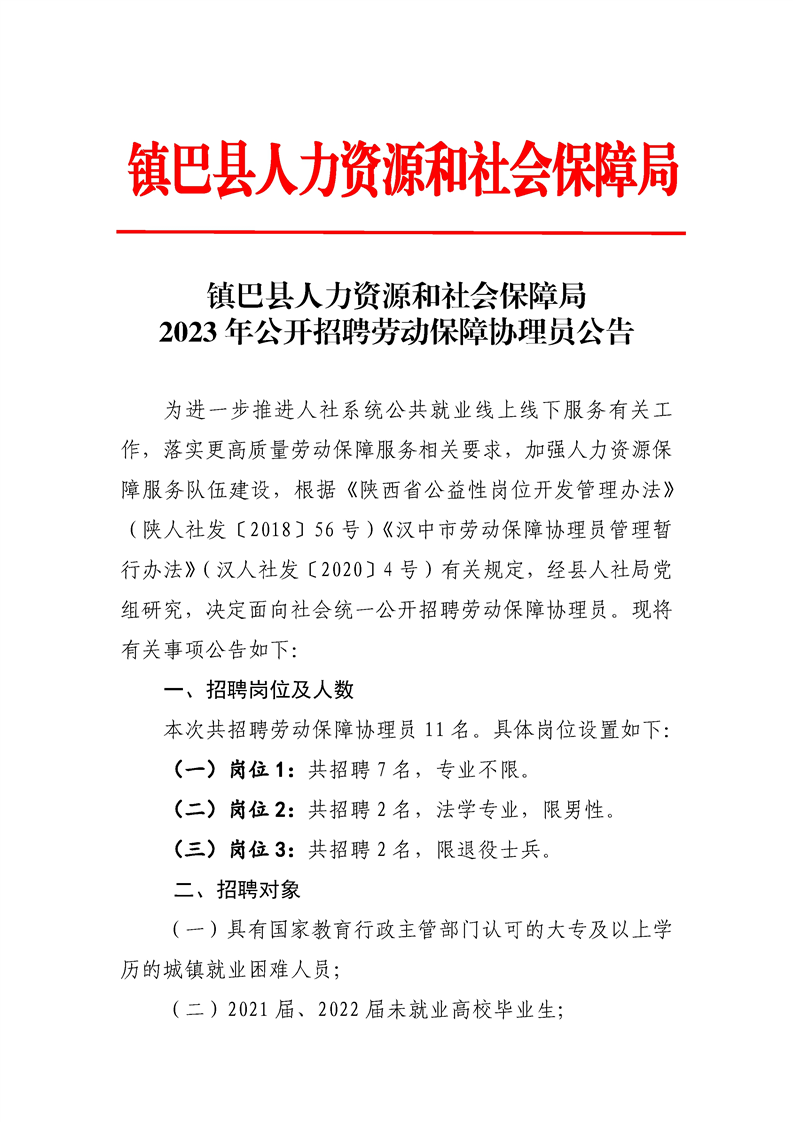 2023年漢中鎮(zhèn)巴縣人力資源和社會(huì)保障局公開(kāi)招聘勞動(dòng)保障協(xié)理員公告