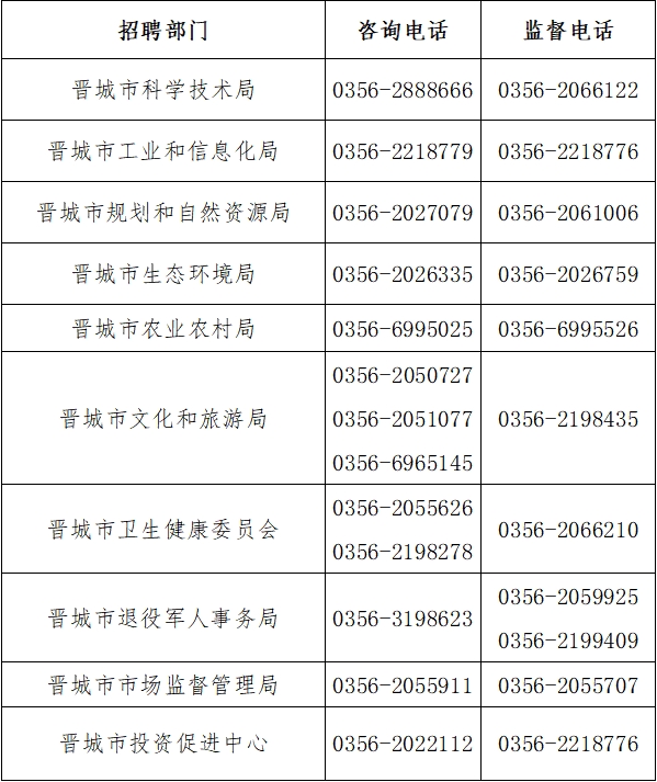 公開招聘期間,相關(guān)信息在以下網(wǎng)站進行發(fā)布:晉城市人民政府網(wǎng)(http://www.jcgov.gov.cn/)、晉城市人力資源和社會保障局官網(wǎng)(http://rsj.jcgov.gov.cn)、“晉城人社”微信公眾號、晉城人才網(wǎng)(www.jcrcw.com)及各招聘單位主管部門網(wǎng)站。請考生隨時關(guān)注網(wǎng)上相關(guān)信息,公開招聘考試接受紀(jì)檢監(jiān)察、新聞媒體、社會各界的監(jiān)督,同時設(shè)立咨詢、監(jiān)督電話。