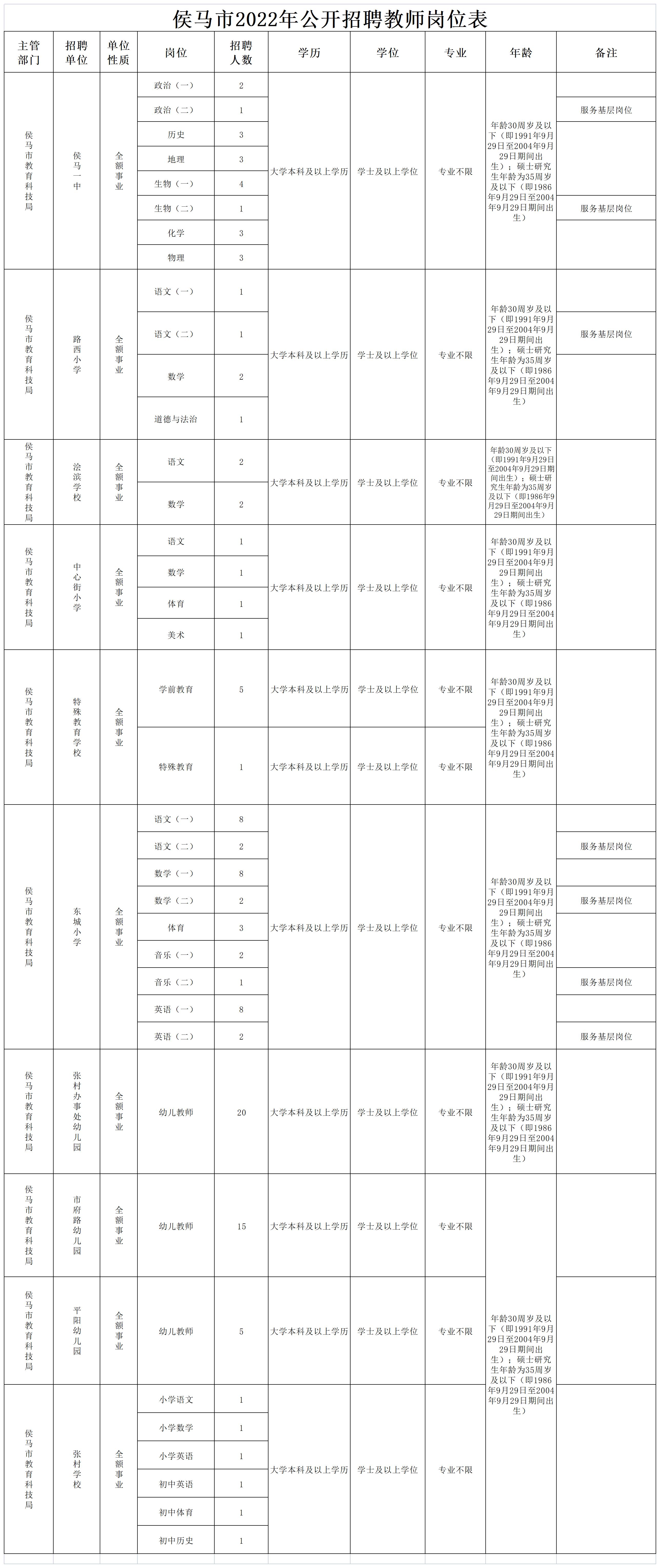 侯馬市2022年公開招聘中小學、幼兒園教師121名。各招聘崗位所需的具體條件以《侯馬市2022年公開招聘教師崗位表》(見附件,以下簡稱《崗位表》)的要求為準。