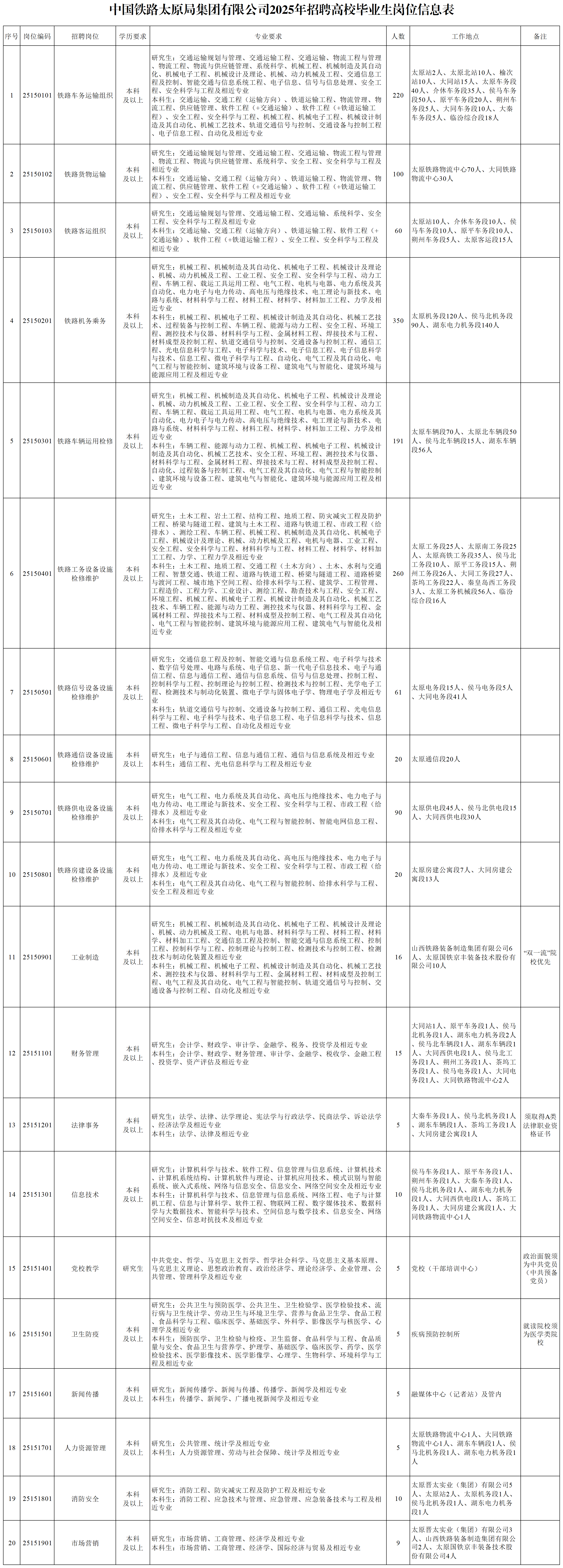 2024-11-02 14:37:50閱讀()中國(guó)鐵路太原局集團(tuán)有限公司根據(jù)企業(yè)發(fā)展需要,現(xiàn)將2025年普通高等院校研究生和全日制本科學(xué)歷畢業(yè)生招聘有關(guān)事項(xiàng)公告如下: