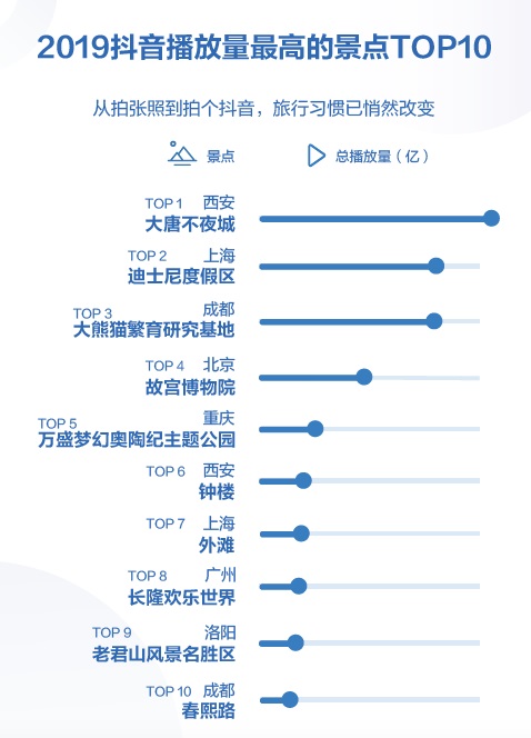 在抖音,一個人帶火一座城已成獨特現(xiàn)象。23歲的抖音用戶@皮卡晨化身“不倒翁小姐姐”,掀起握手狂潮,吸引人們爭相實地打卡。報告顯示,#大唐不夜城不倒翁#相關視頻播放量超23億次,西安大唐不夜城景點位列2019抖音播放量最高的景點首位,其次為上海迪士尼度假區(qū)和成都大熊貓繁育研究基地。