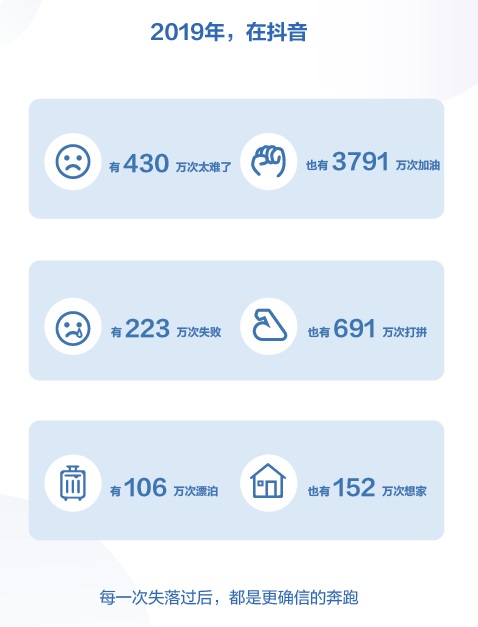 報告顯示,2019年有46萬個家庭在抖音拍下全家福視頻,記錄一家人相親相愛的幸福時刻,相關視頻被點贊1億次。同時,人們也在抖音記錄下淚水與歡笑,全年抖音上有430萬次“太難了”,也有3791萬次加油;有223萬次失敗,但也有691萬次打拼。