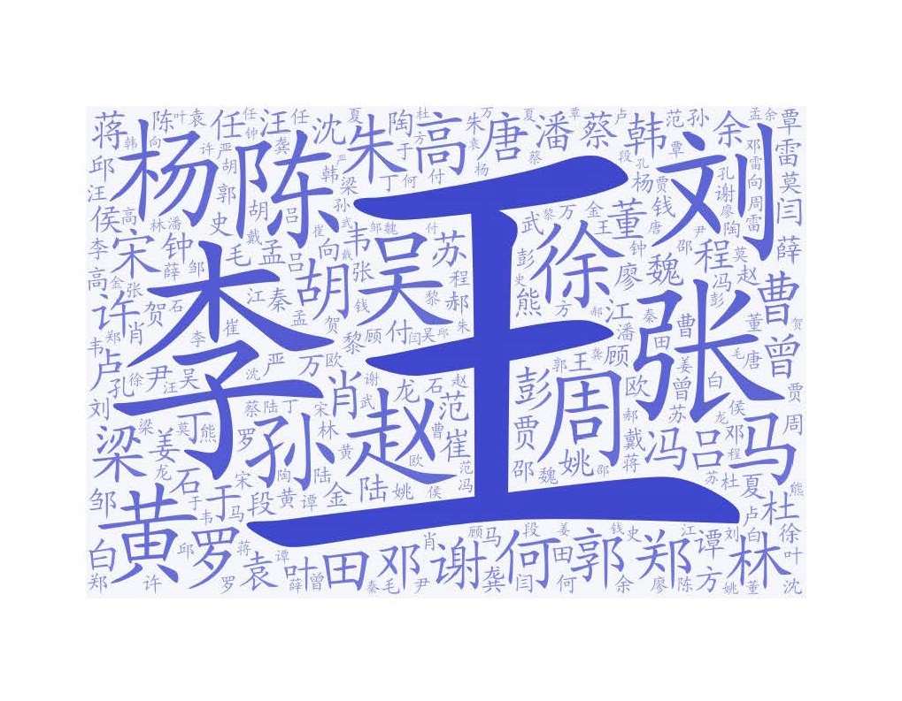 全國31個省(區(qū)、市)的姓氏人口分布不盡相同。“王”姓是全國第一大姓氏,同時也是北京、天津、河北、山西、內(nèi)蒙古、遼寧、吉林、黑龍江、江蘇、安徽、山東、河南、海南、陜西、甘肅、新疆16個省(區(qū)、市)第一大姓。“李”姓為湖北、湖南、重慶、四川、云南第一大姓。“張”姓為上海第一大姓。“劉”姓為江西第一大姓。“陳”姓為浙江、福建、廣東第一大姓。“楊”姓為貴州第一大姓。“黃”姓為廣西第一大姓。“馬”姓為青海、寧夏第一大姓。