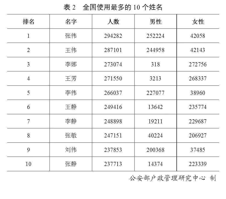 全國戶籍人口中,使用頻率最高的10個姓名依次為:“張偉”“王偉”“李娜”“王芳”“李偉”“王靜”“李靜”“張敏”“劉偉”“張靜”。這些姓名男女皆有使用。