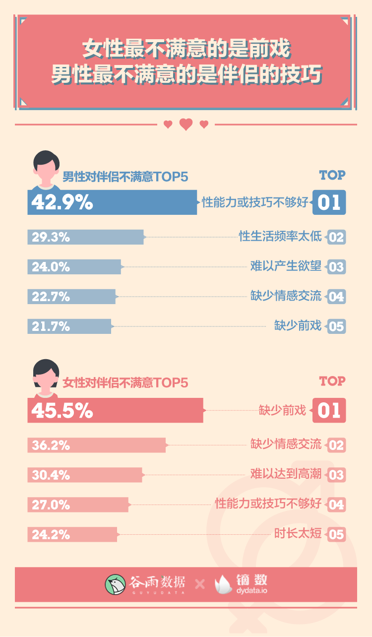 在對(duì)伴侶不滿意的各項(xiàng)原因里,讓女性最不滿意的是“缺少前戲”,讓男性最不滿意的是“性能力或技巧不夠好”。
