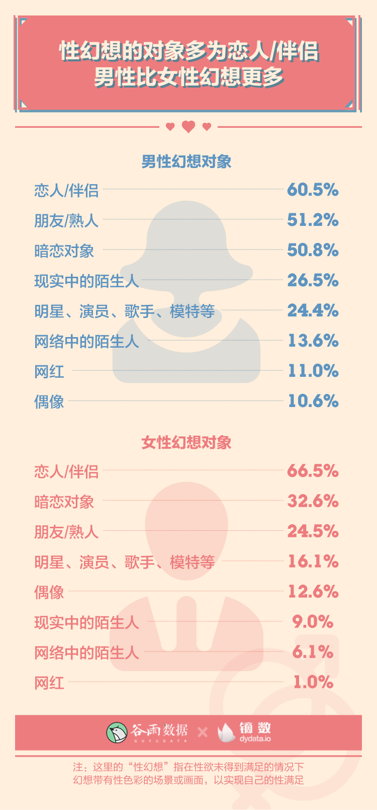 雖然不分男女,排名前三的性幻想對(duì)象都是:戀人/伴侶、暗戀對(duì)象、朋友/熟人,但男性的性幻想對(duì)象明顯更加多元,女性則相對(duì)集中。