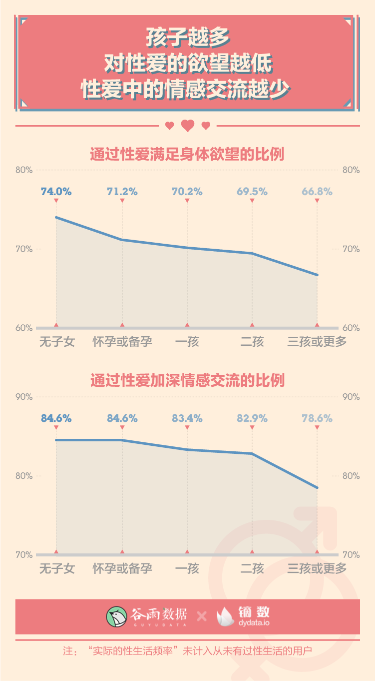 調(diào)查還顯示,孩子越多,對(duì)性愛的欲望就越低,性愛中的情感交流就越少。 每一個(gè)孩子的出生,可能都在讓無性婚姻越來越近。