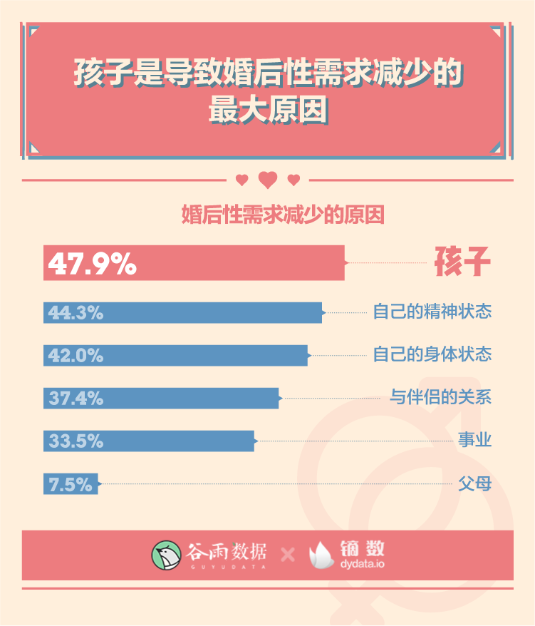 我們的調(diào)查顯示,在所有導(dǎo)致婚后性需求減少的原因中,“孩子”超越了“精神狀態(tài)”、“身體狀態(tài)”、“伴侶關(guān)系”等,成為性生活的“頭號(hào)殺手”。