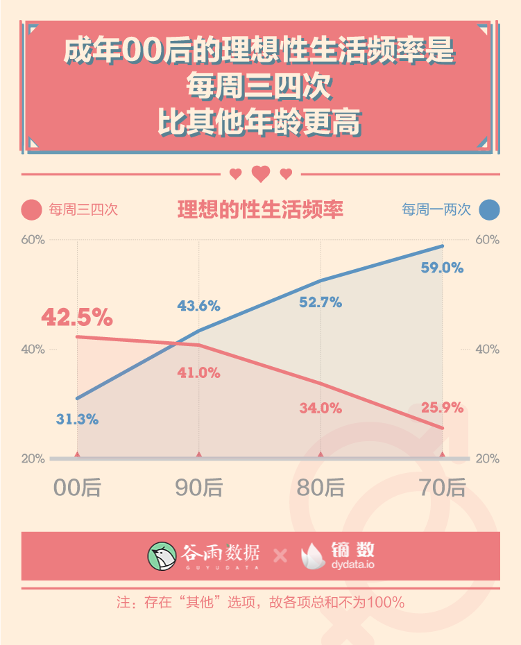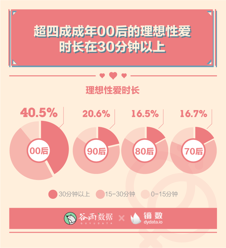 年輕的身體里裝著更加旺盛的性需求。超四成的成年00后理想性生活頻率是每周三四次,理想性愛時(shí)長(zhǎng)在30分鐘以上,這兩個(gè)比例都比其他年齡更高。