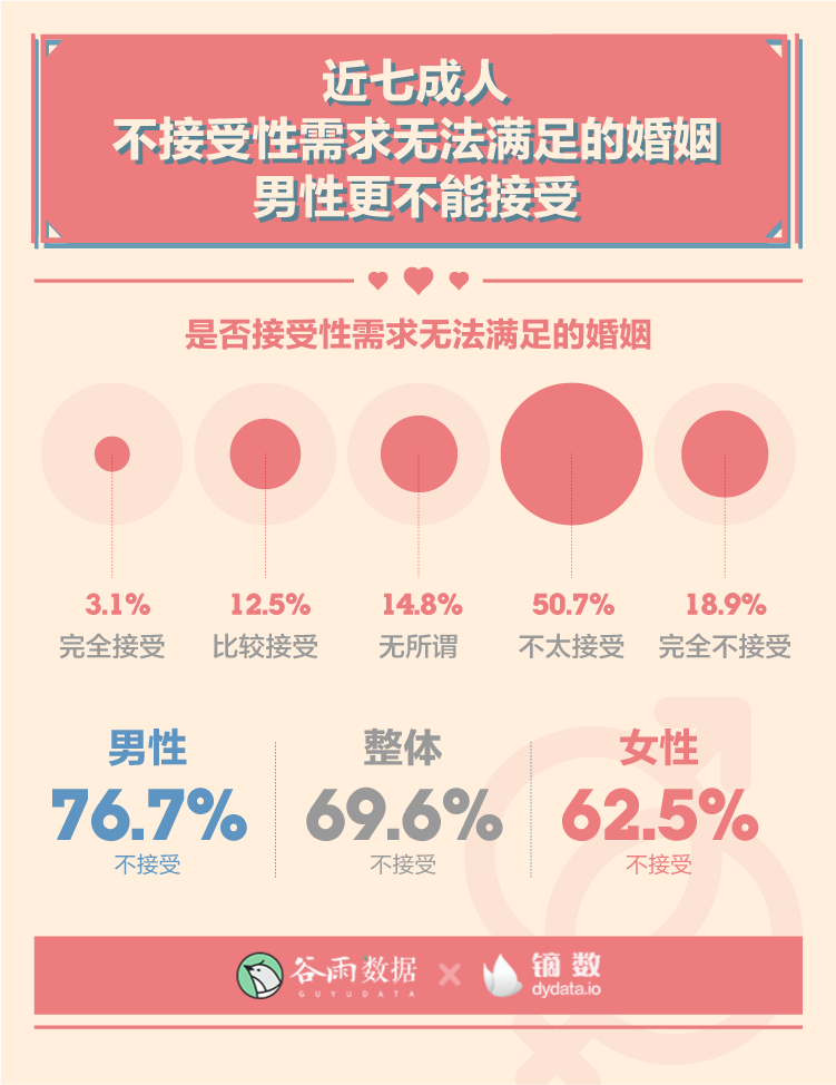 性在婚姻中是否是必不可少的?對(duì)于大多數(shù)人來說,性需求無法滿足都會(huì)成為婚姻的致命傷。76.7%的男性和62.5%的女性不接受性需求無法滿足的婚姻。