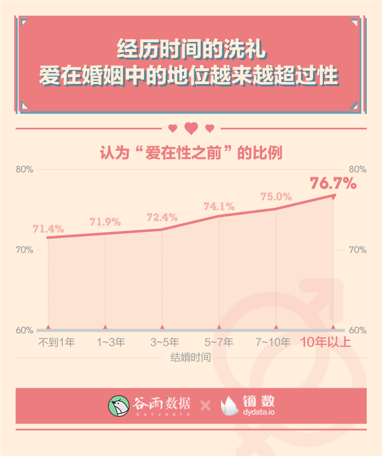 在所有結(jié)婚時(shí)間段中,結(jié)婚10年以上的人認(rèn)為“愛在性之前”的比例達(dá)到最高,為76.7%。