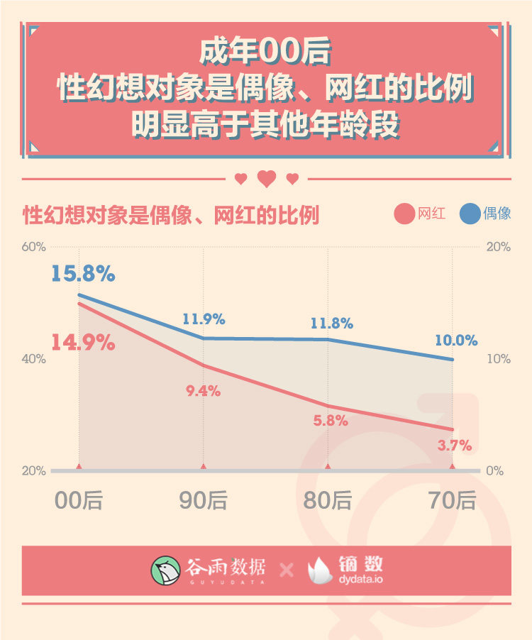 另外,作為網(wǎng)絡(luò)時(shí)代的“土著”,成年00后們性幻想對(duì)象是偶像、網(wǎng)紅的比例也明顯高于其他年齡段。