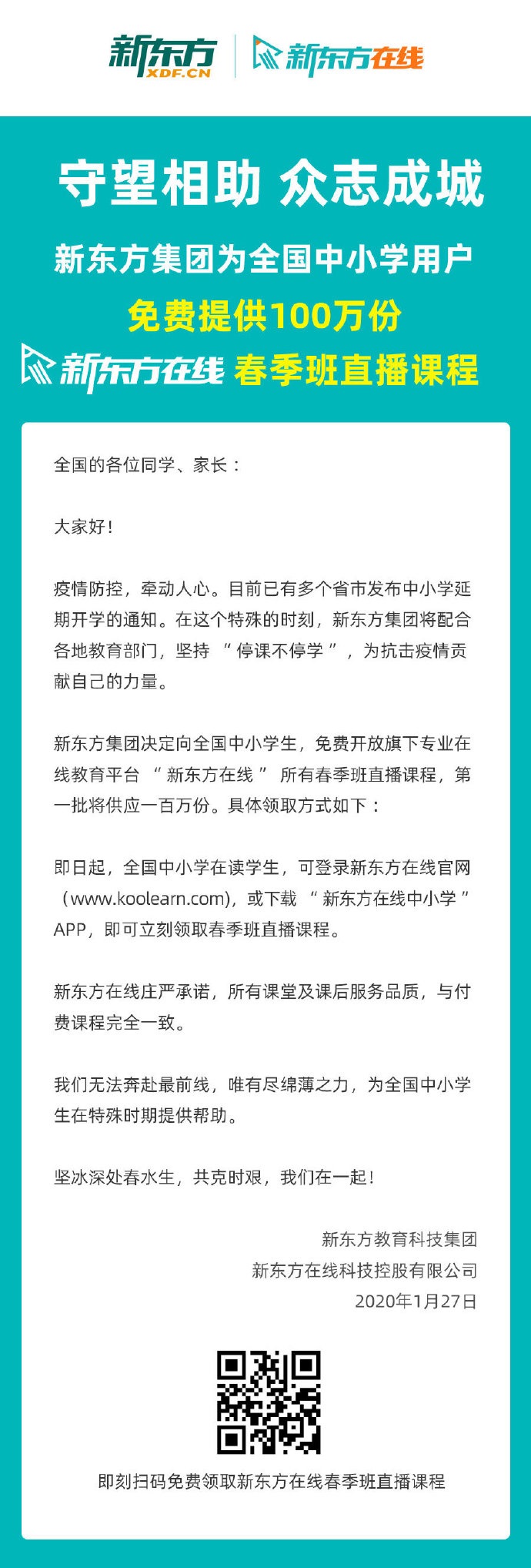 新東方在線表示,目前已有多個(gè)省市發(fā)布中小學(xué)延遲開(kāi)學(xué)的通知,在這個(gè)特殊時(shí)刻,新東方集團(tuán)將配合各地教育部門,向全國(guó)中小學(xué)生免費(fèi)開(kāi)放旗下專業(yè)在線教育平臺(tái)“新東方在線”所有春季班直播課程,第一批將供應(yīng)一百萬(wàn)份。