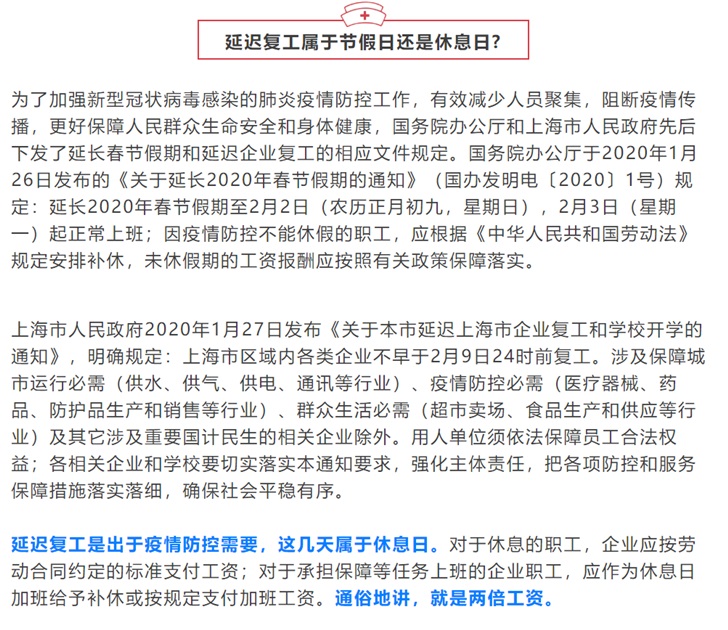日前,國務(wù)院辦公廳于2020年1月26日發(fā)布的《關(guān)于延長2020年春節(jié)假期的通知》(國辦發(fā)明電〔2020〕1號)規(guī)定:延長2020年春節(jié)假期至2月2日(農(nóng)歷正月初九,星期日),2月3日(星期一)起正常上班;因疫情防控不能休假的職工,應(yīng)根據(jù)《中華人民共和國勞動法》規(guī)定安排補休,未休假期的工資報酬應(yīng)按照有關(guān)政策保障落實。