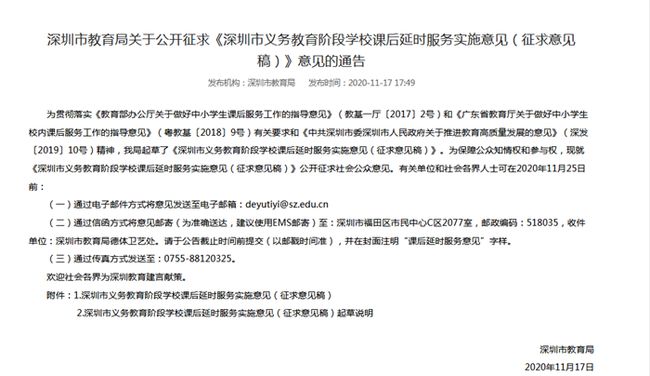 11月17日,深圳市教育局發(fā)布了《深圳市義務(wù)教育階段學(xué)校課后延時服務(wù)實施意見(征求意見稿)》(以下簡稱《實施意見》),擬對課后延時服務(wù)做一些新的規(guī)定。