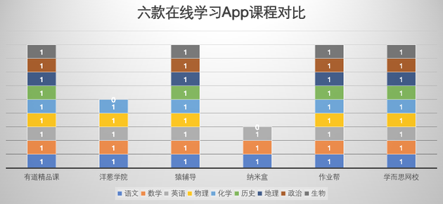 我們將階段設置為高三對比六款App的課程范圍,可以看到除了洋蔥學院和納米盒之外,其它產(chǎn)品都是全能選手。