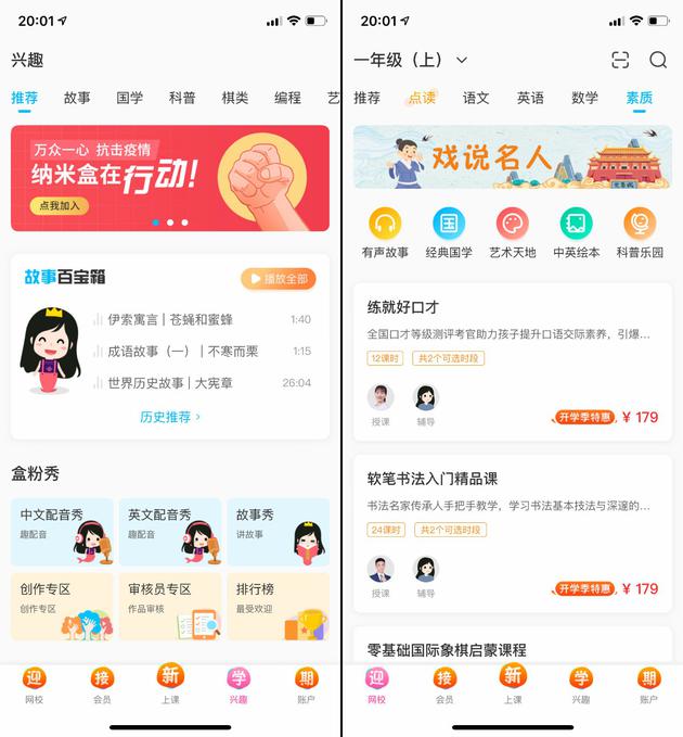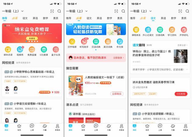 納米盒則是以小學學習內(nèi)容為主的 App,只覆蓋了語數(shù)外三門課,這也是當我們將課程設置為高中時只能提供點讀內(nèi)容的一大原因。但同時,納米盒還提供了了諸多興趣類課程,這一點很難得。
