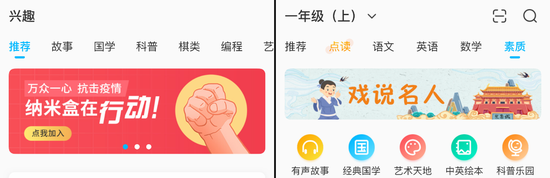 與其他產(chǎn)品不同的是,納米盒提供了興趣功能,學生在這里可以了解一些課外知識,包括國學、科普等。同時,納米盒也是唯一在科目中引入素質(zhì)項目的 App。