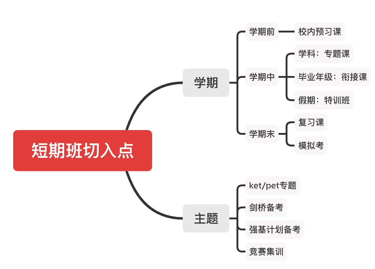 短期班是以「試聽課」為出發(fā)點(diǎn),感受老師(教學(xué)風(fēng)格、實(shí)力等)、產(chǎn)品(課程質(zhì)量、使用實(shí)用工具等)、服務(wù)(答疑、資料等)等多個(gè)方面。基于主要的知識點(diǎn)包裝個(gè)短期班,也會(huì)根據(jù)時(shí)期匹配試點(diǎn)課的內(nèi)容,比如劍橋備考,給一個(gè)觸手去接觸到用戶。
