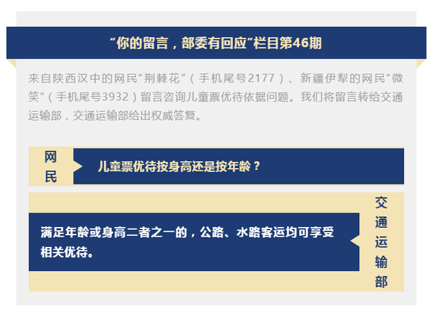 交通運輸部在公路、水路客運領域已經建立了兼顧年齡和身高標準的票價優(yōu)待機制,先后印發(fā)《交通運輸部 發(fā)展改革委關于深化道路運輸價格改革的意見》(交運規(guī)〔2019〕17號)、《交通運輸部關于做好<國內水路運輸管理規(guī)定>實施有關工作的通知》(交水規(guī)〔2020〕6號),明確對符合條件的兒童提供免費乘坐客運班車(國內水路客運船舶)或者客票半價優(yōu)待(9座及以下客車除外)。
