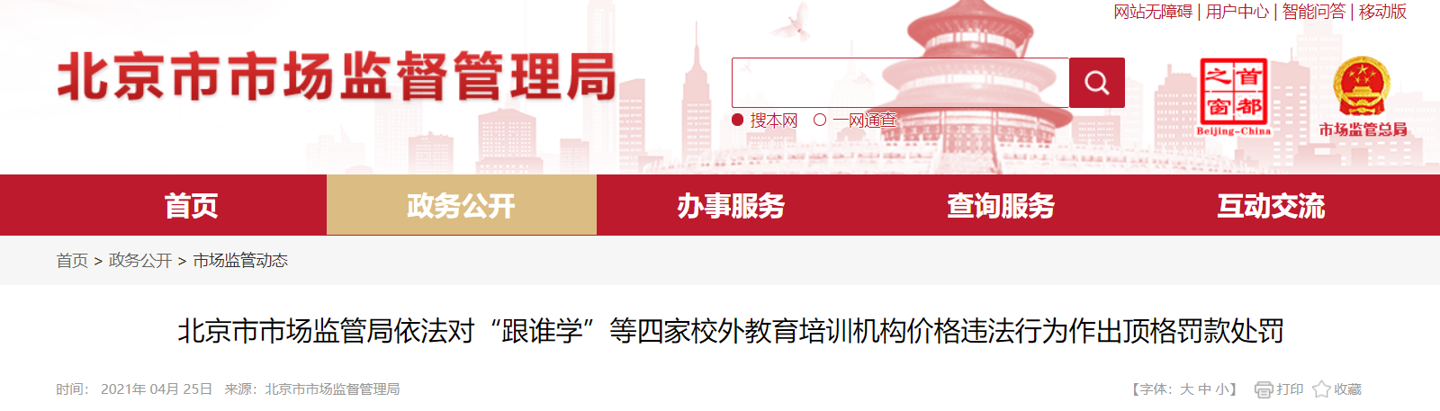 北京市市場(chǎng)監(jiān)管局依法對(duì)“跟誰(shuí)學(xué)”等四家校外教育培訓(xùn)機(jī)構(gòu)價(jià)格違法行為作出頂格罰款處罰