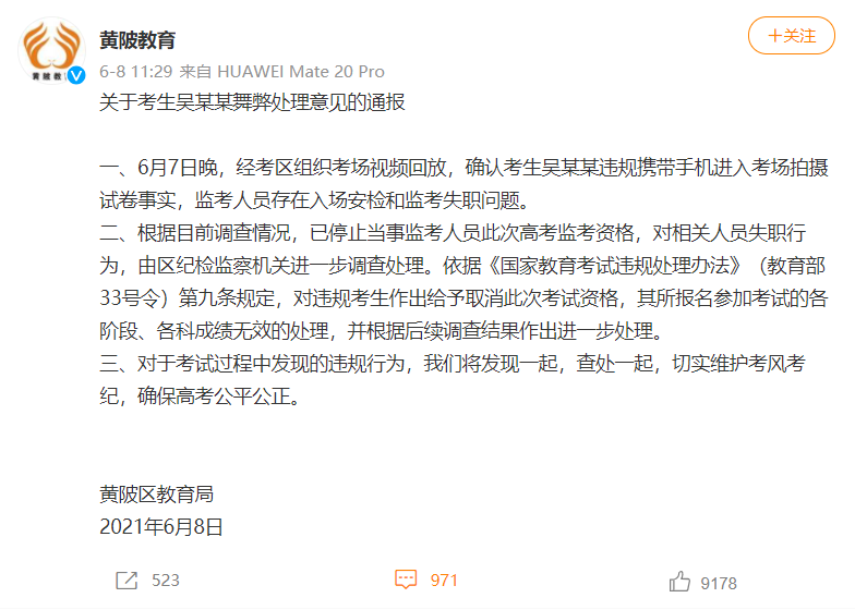 一、6月7日晚,經(jīng)考區(qū)組織考場(chǎng)視頻回放,確認(rèn)考生吳某某違規(guī)攜帶手機(jī)進(jìn)入考場(chǎng)拍攝試卷事實(shí),監(jiān)考人員存在入場(chǎng)安檢和監(jiān)考失職問題。