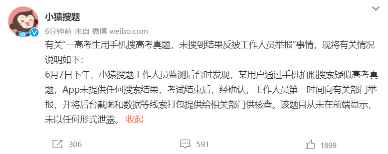 剛剛,小猿搜題官方也發(fā)布公告,對(duì)有關(guān)“一高考生用手機(jī)搜高考真題,未搜到結(jié)果反被工作人員舉報(bào)”事情,現(xiàn)將有關(guān)情況說明如下: