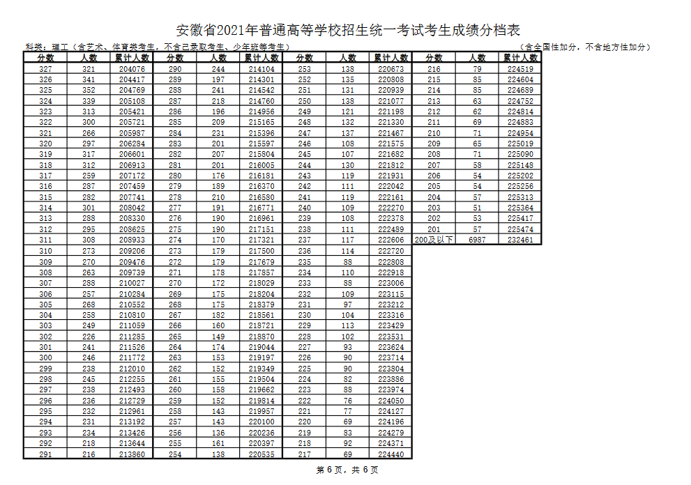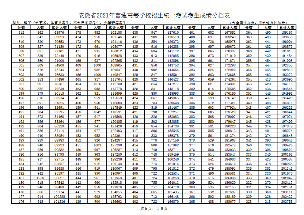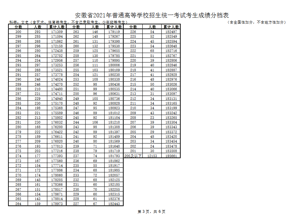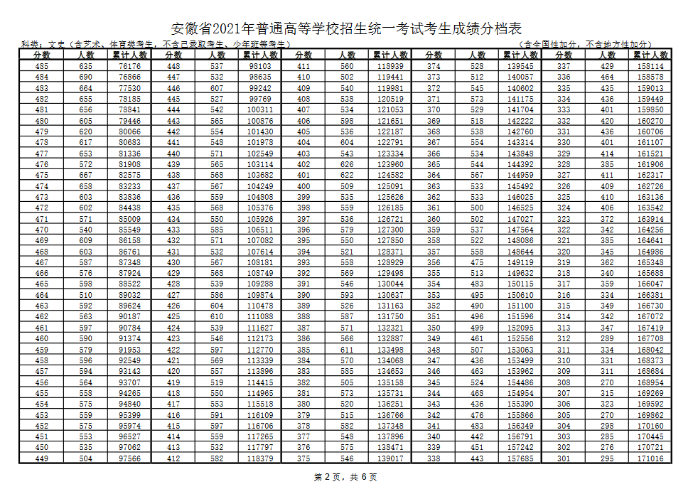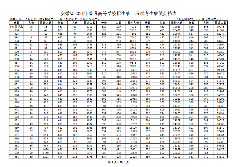 安徽省2021年普通高等學(xué)校招生統(tǒng)一考試考生成績分檔表公布,文科670分及以上,35人;理科697分及以上,36人。