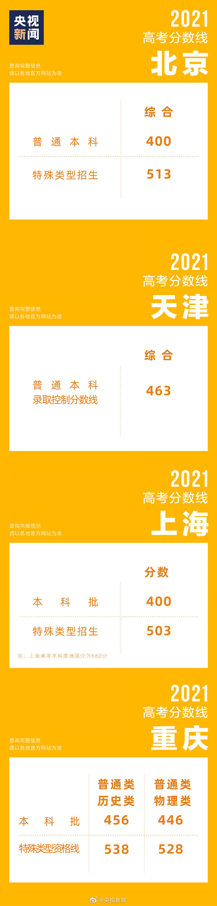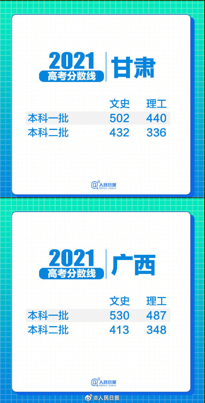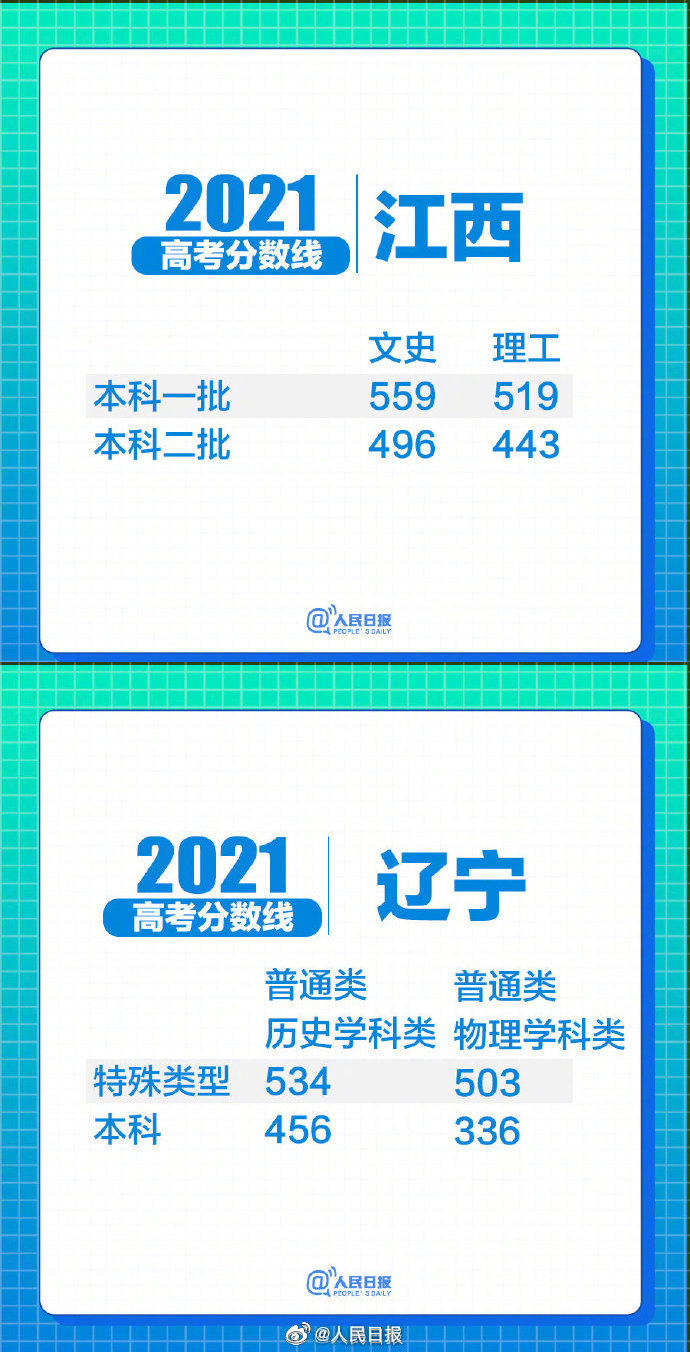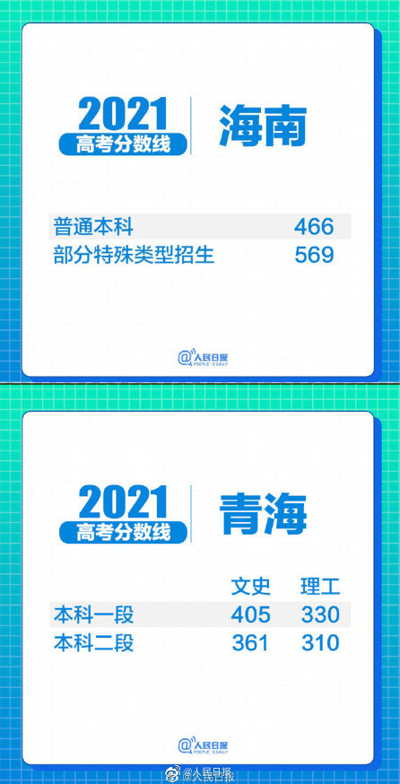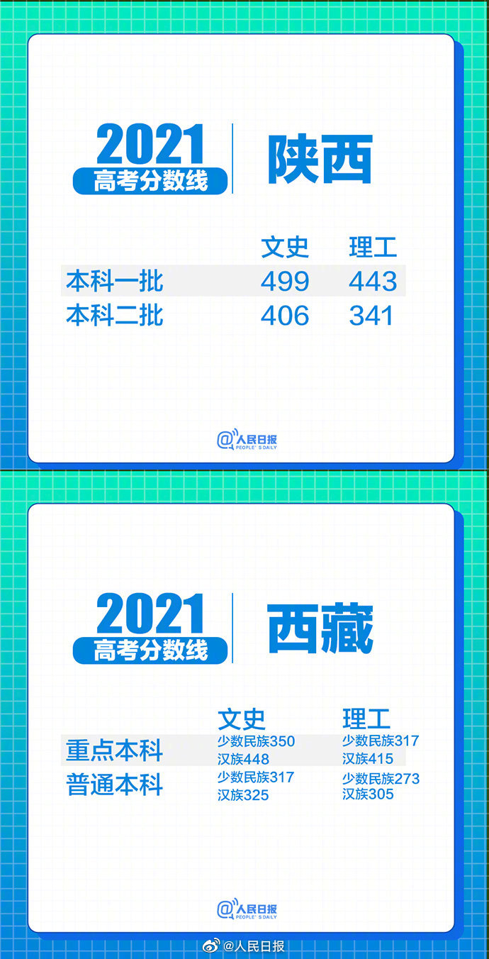 2021-06-26 17:23:14閱讀()人民日報31省區(qū)市2021高考分?jǐn)?shù)線匯總,截至目前,31個省區(qū)市已陸續(xù)公布了2021年高考各批次錄取分?jǐn)?shù)線↓↓祝大家都能進(jìn)入自己理想的大學(xué)! ????